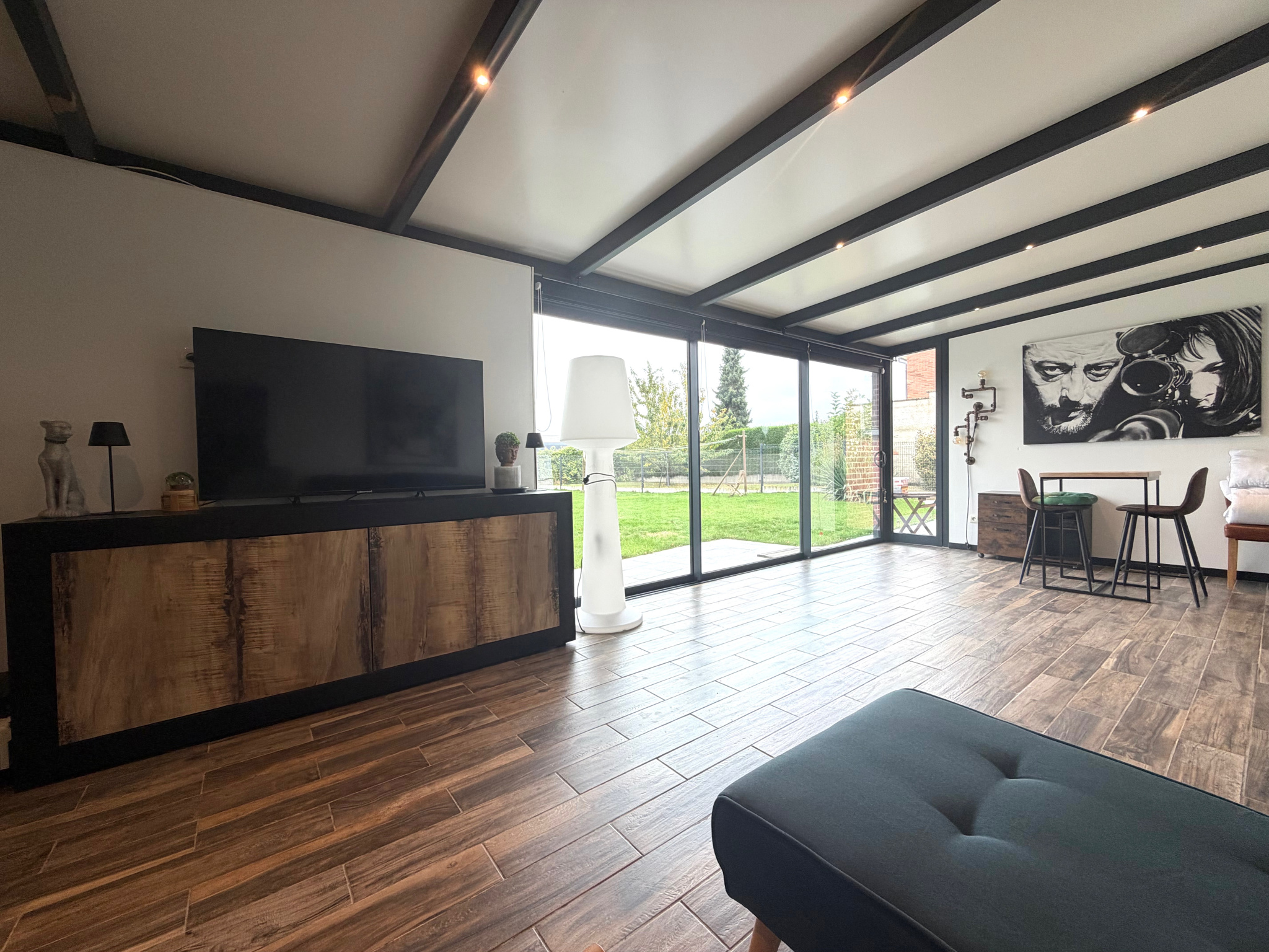 Terrasse et jardin avec chalet.