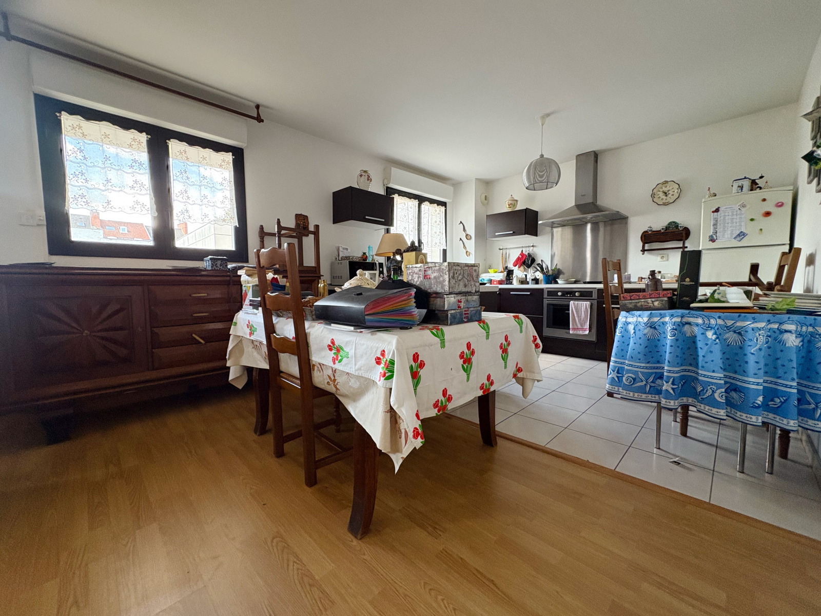 Appartement rez de chaussée, offrant hall d'entrée, cuisine équipée ouverte sur séjour, cellier, 2 chambres, salle de bains, WC, garage.