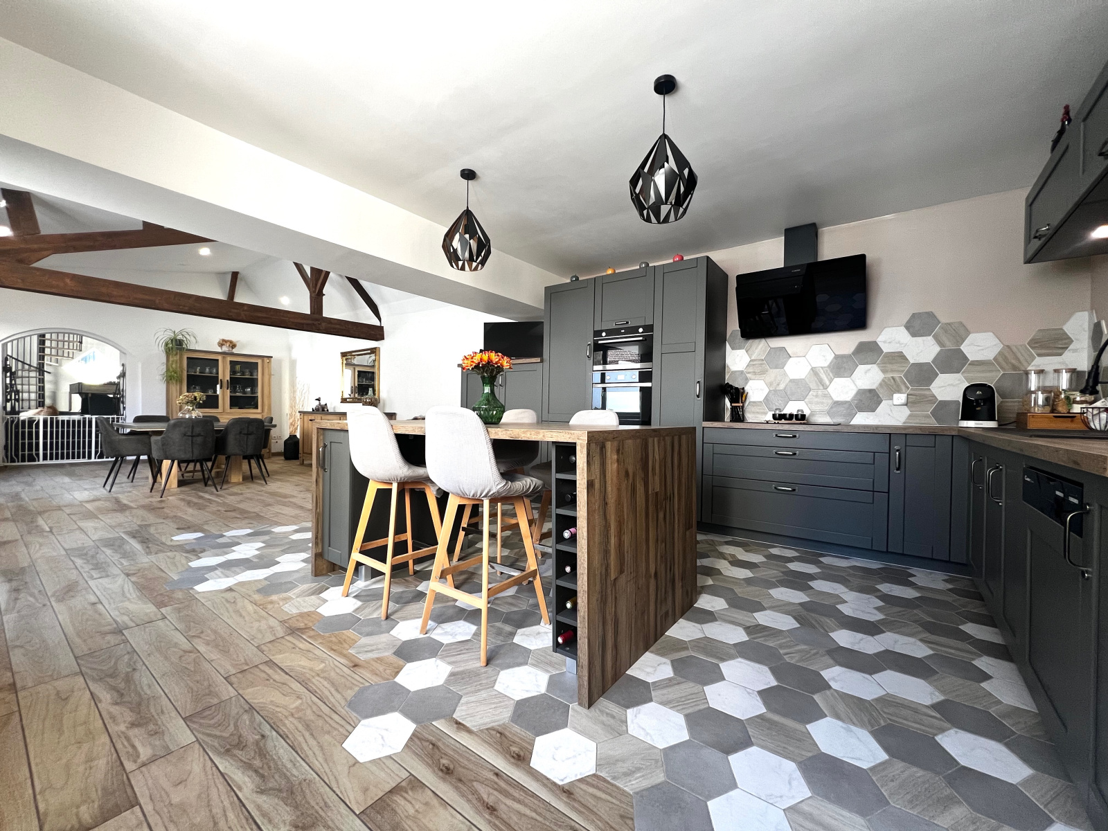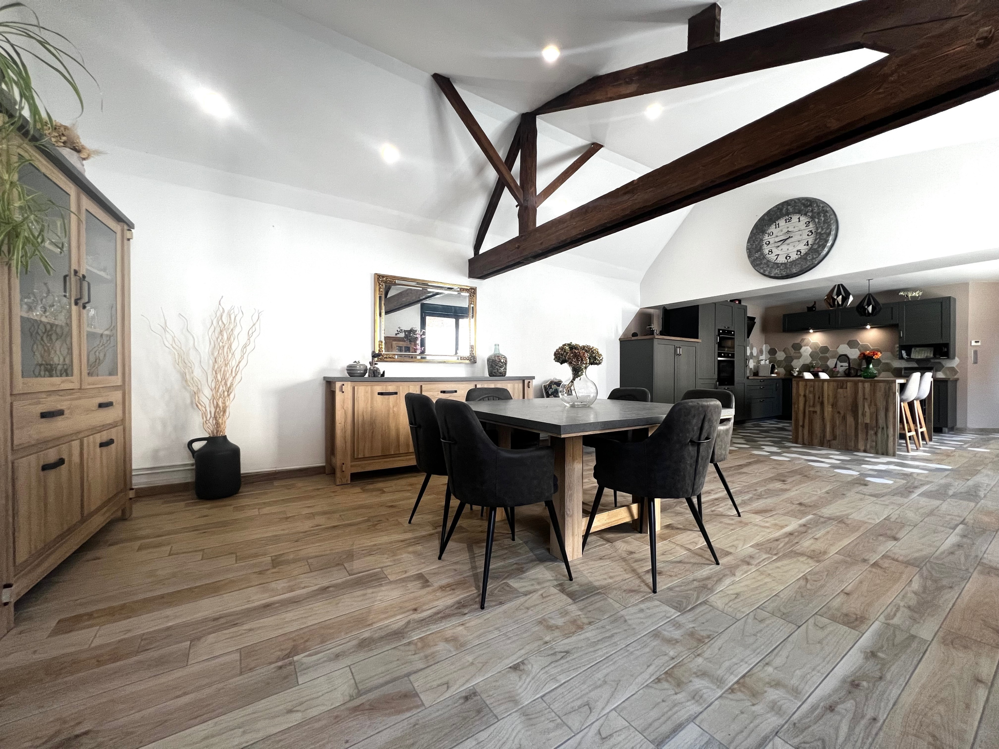 Longère individuelle d'environ 250 m2 habitables, offrant au RDC entrée, cuisine meublée et équipée avec espace repas ouverte sur salle à manger, séjour, salle de baisn avec baignoire et douche, dressing, buanderie.